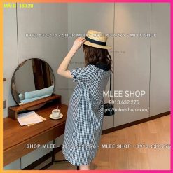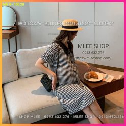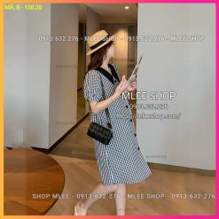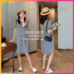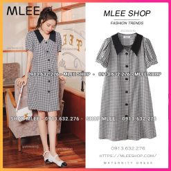 Đầm Bầu Công Sở – Váy Bầu kẻ caro đen, dáng suông, cúc dọc phôi cổ đen, chất cotton