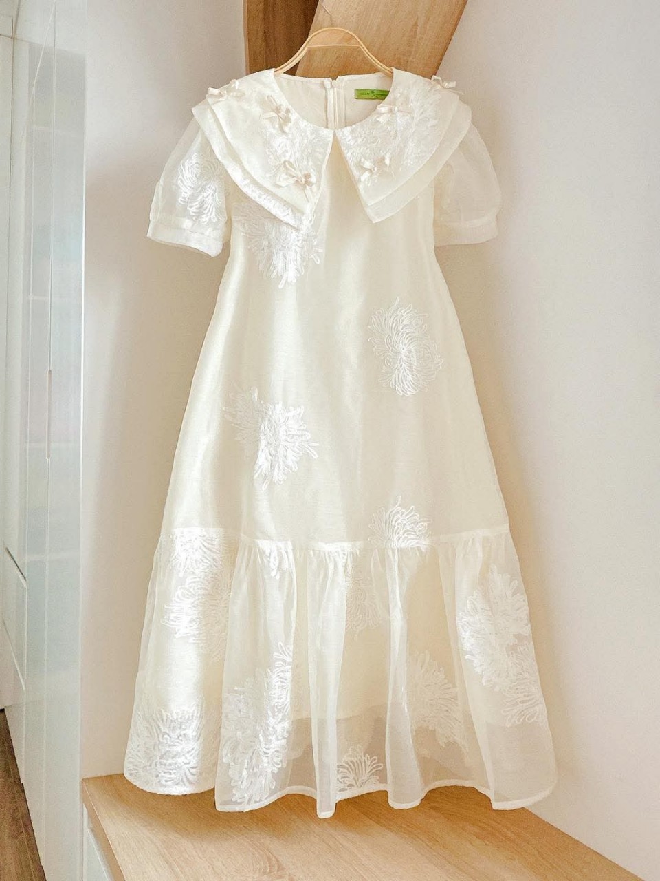 - Thiết kế cổ sen thêu nổi tinh tế, nữ tính